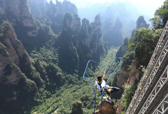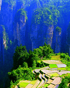 張家界,是湖南一個著名的風景區,一座天然的森林公園。黃石寨、天子山、金鞭溪等勝境,是令游人心馳神往之地。在我們出發(fā)之初,心就早已高高飛揚,五個多小時的顛簸終于把我們載到了目的地,導游是一個年輕的女孩子,一見面就放開歌喉唱了首當地土家族的歌謠,歌聲婉轉動聽,一下子讓我們領略到了鄉村